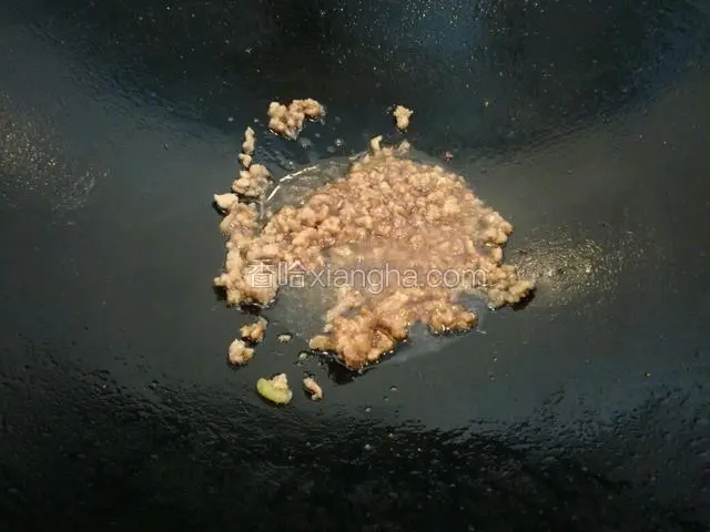 6.锅中加油炒肉末,加入蚝油继续翻炒。