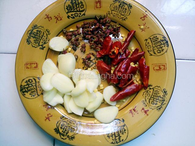 2.蒜切片,干辣椒切小节,花椒