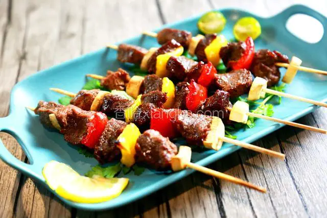 6.取出后用竹签分别串上红椒、黄椒、杏鲍菇和腌制好的牛肉,放进预热好的Westinghouse西屋WTO-PC2801烤箱,选择蒸烤模式,200度,烤20分钟