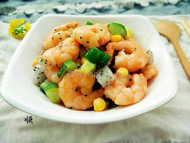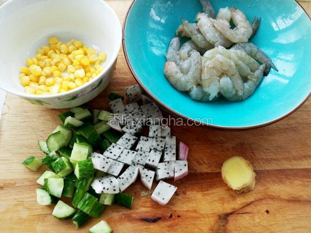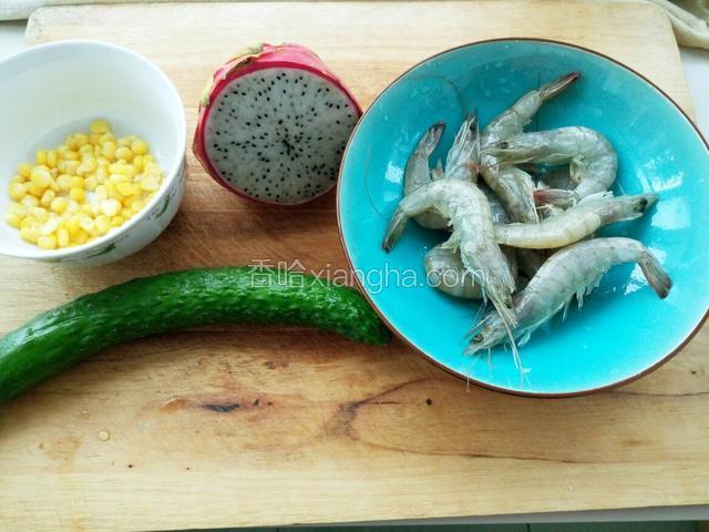 2.黄瓜 火龙果切丁 大虾去皮 挑虾线 姜切片