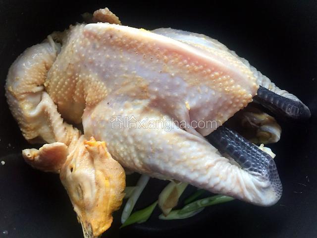 6.鸡内腔也放些葱段和姜片,然后将鸡放入锅中。