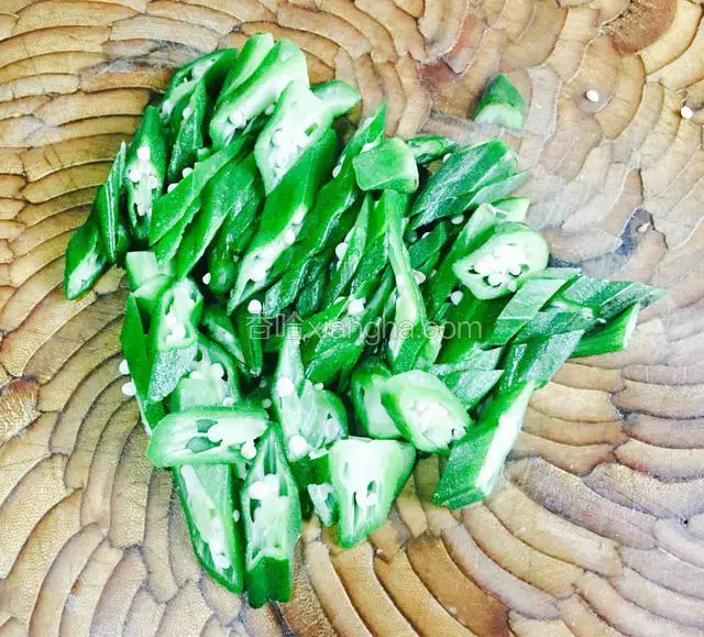 3.锅中烧开水加一勺盐把去蒂洗净的秋葵放入锅中煮两分钟,捞起过凉水。