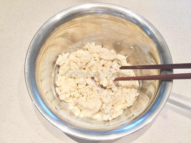 5.我做了两种面团,先来做烫面团。将150克面粉放入料理盆中,加入少许盐,逐步倒入适量的开水,用筷子搅拌成棉絮状;
