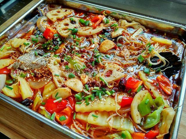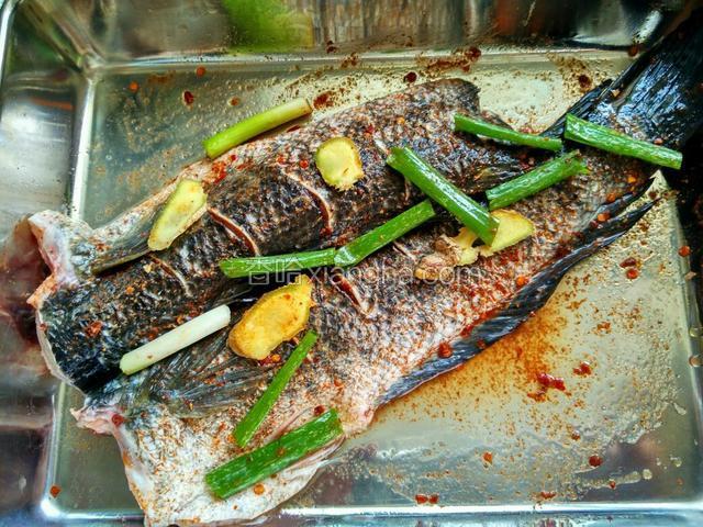 2.在鱼两侧均匀抹上,盐,料酒,香锅调料粉,白胡椒粉,五香粉,花椒粉,鱼肚内也要抹上,上下两面撒上葱姜,腌制两小时或者以上。(鱼太长,烤盘放不下,把鱼头去除了)
