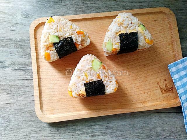 5.大片海苔剪成条状,青瓜与芝士均切丁状,备好现成的肉松