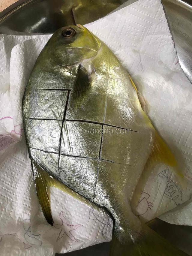 1.将金鲳鱼用清水洗净,用厨用剪在腹下剪一个小口子(小一点,一个手指头能伸进去即可)。
