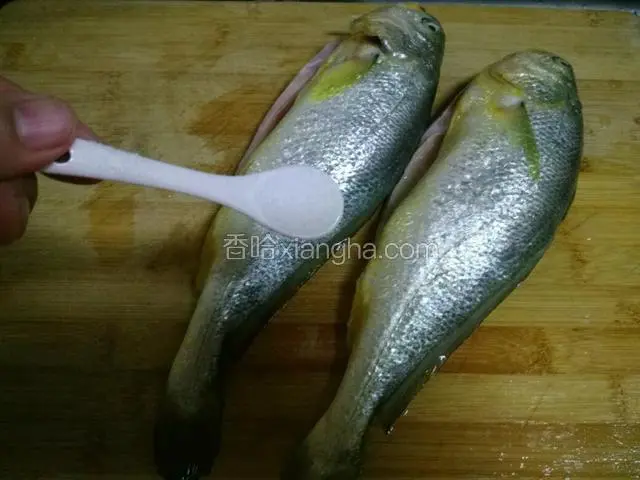 2.洗净之后沥干水,黄鱼两面抹上少许盐,防脱鱼皮