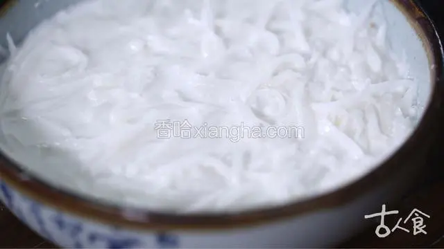 3.大米粉和淀粉加入三百克水,放入萝卜丝拌匀