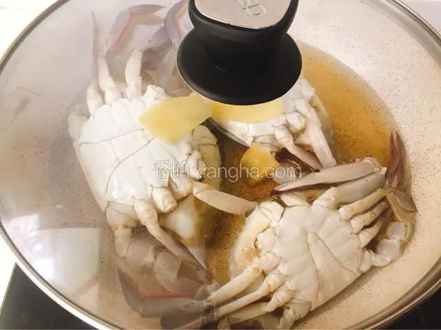 2.螃蟹反过来,肚子朝上放,加一杯水,料酒2勺,生姜片3片