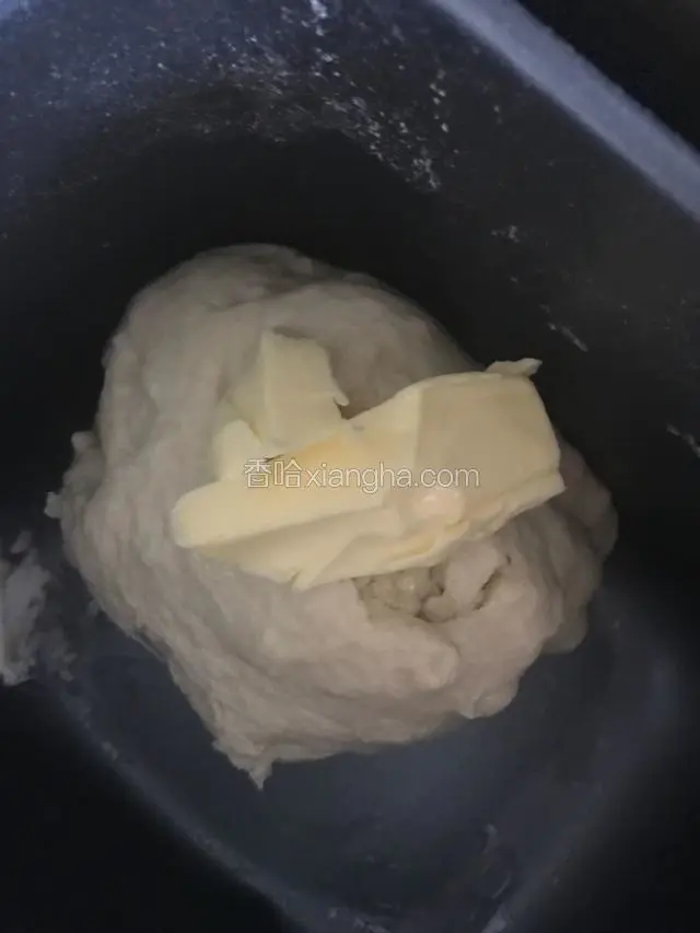3.大概和20分钟后放入软化黄油,继续和,直到面撑开套在手上成薄薄的手膜就和好了,(因为我做了美甲,指甲长所以手膜没拍照)