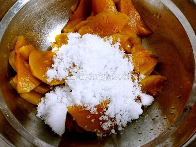 4.蒸熟的南瓜倒入干净的盆中,趁热加入白糖