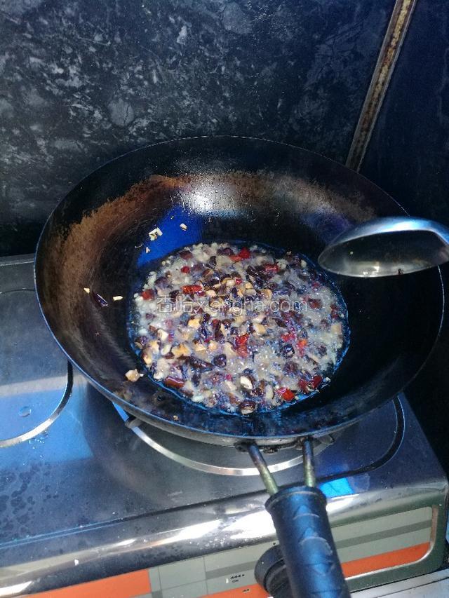 3.取适量油,依次放入:姜、蒜、辣椒、古方红糖,炒出味后放入香菇丁