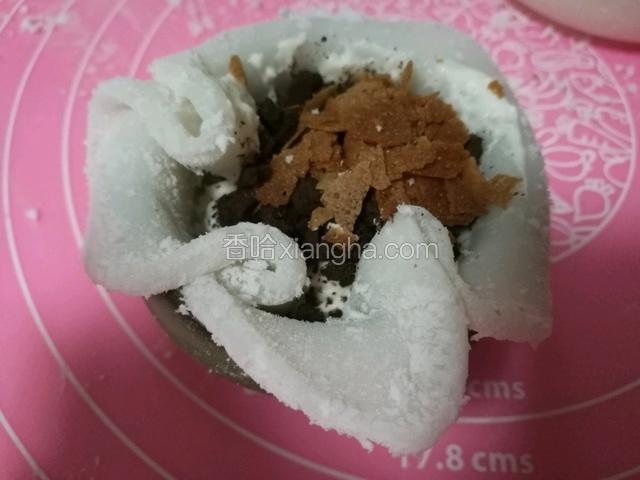 3.倒点奥利奥,放点脆片,没脆片就不放。再盖一点奶油。