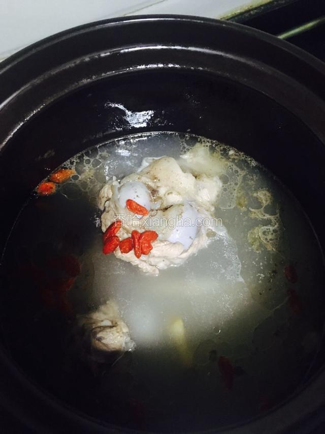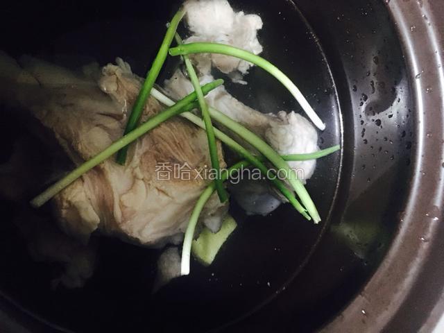 6.准备一个干净的砂锅把焯好水的棒骨放在锅里,加清水没过棒骨就好,再放入葱段和姜片开大火烧开。
