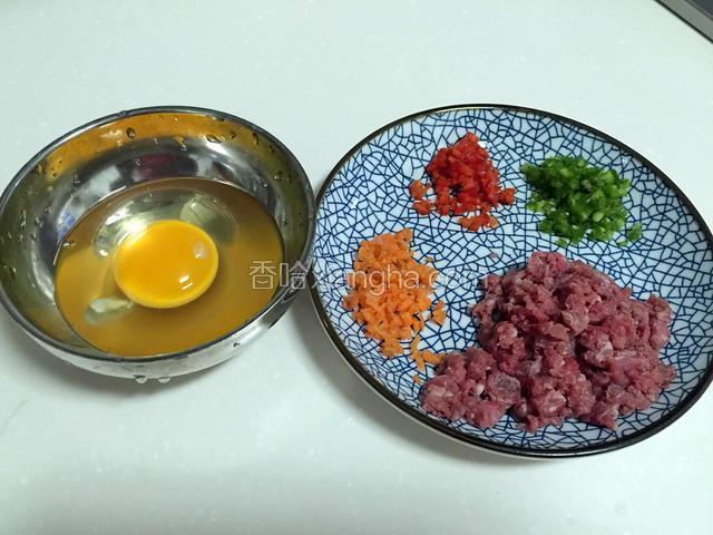 2.鸡蛋打入碗中,牛肉切末,红椒、绿椒、胡萝卜切碎。