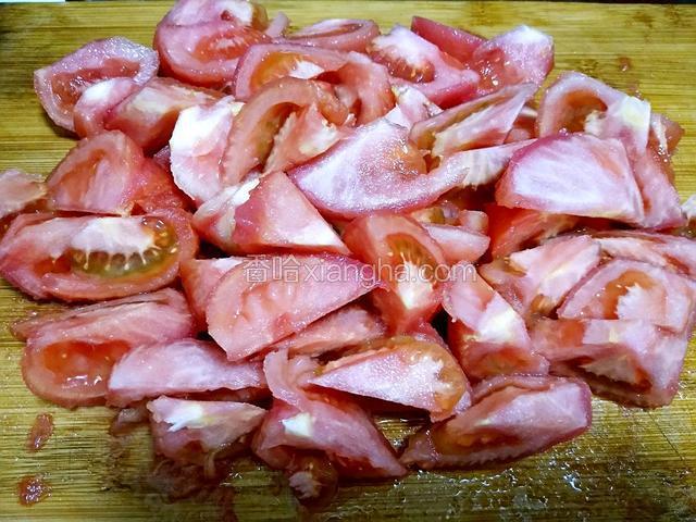 5.放入烧开的沸水中煮一分钟,如果水没盖过番茄就要把番茄翻一翻,整个番茄皮都要烫到