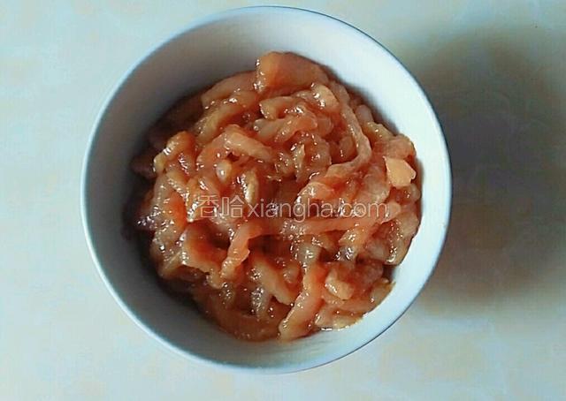 3.把瘦肉洗净切丝,装入小碗里放入料酒,生抽,蚝油,生粉,白糖拌匀。