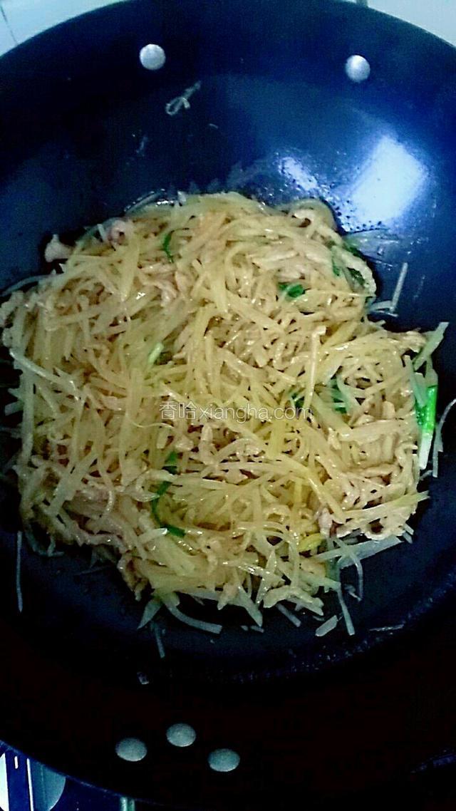 2.土豆削皮洗净切丝,用清水漂洗两三遍,再把土豆丝放清水里,倒一勺白醋漂三分钟捞起待用。