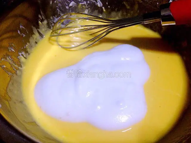 6.划井字搅拌后再加一个蛋黄,依次将4个蛋黄全部搅拌到面粉中