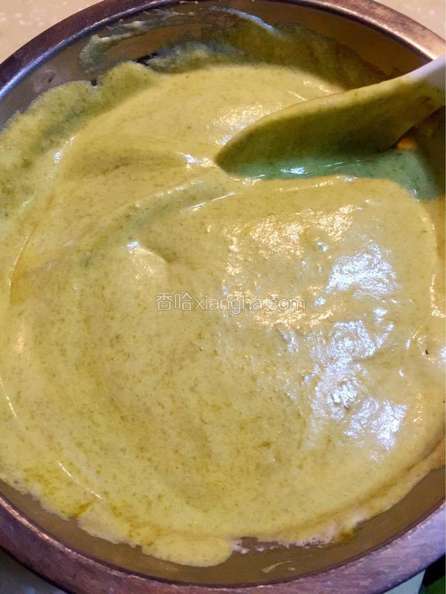 2.蛋黄蛋白分在两个盆里,蛋黄里加入牛奶和油,筛入抹茶粉,搅拌均匀