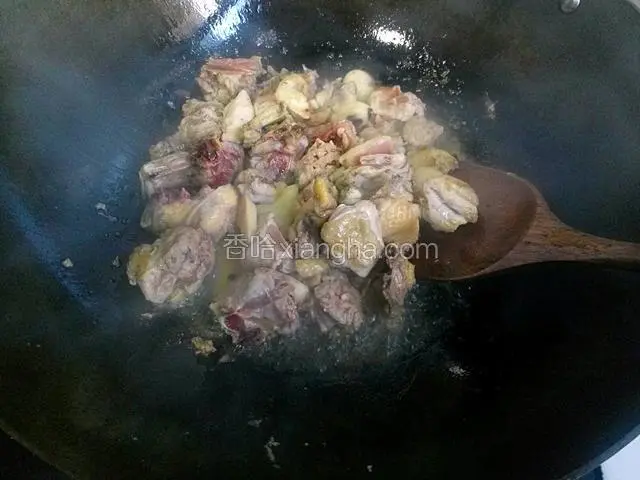 4.热锅放油少许,在倒入剁好的鸡块,加姜片,盐炒入味,