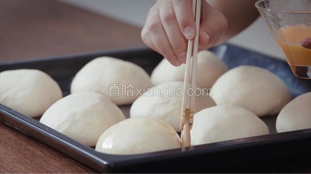 6.等面团发酵至1.5倍大,均匀涂上蛋液,在面皮中央粘上白芝麻,稍微晾干;