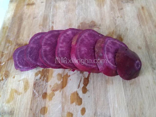 5.蒸熟的紫薯放入盘里,加入白糖,用勺子压成泥