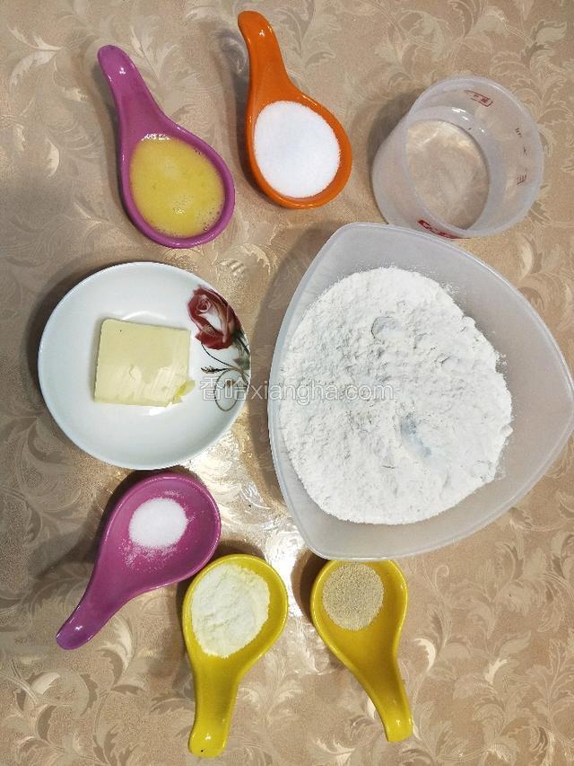 2.所有材料,除黄油外,其他先液体后粉类,盐和糖对角放,酵母放中间。启动和面20分钟