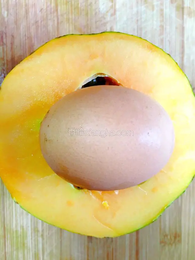 3.木瓜底部切平,利用小勺把里面的籽挖空,再挖去一小部分果肉