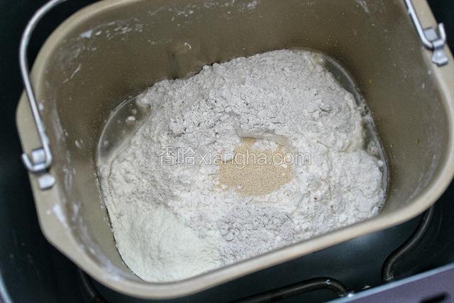 1.将除黄油外的食材放入面包桶内,启动面包机揉面程序开始揉面