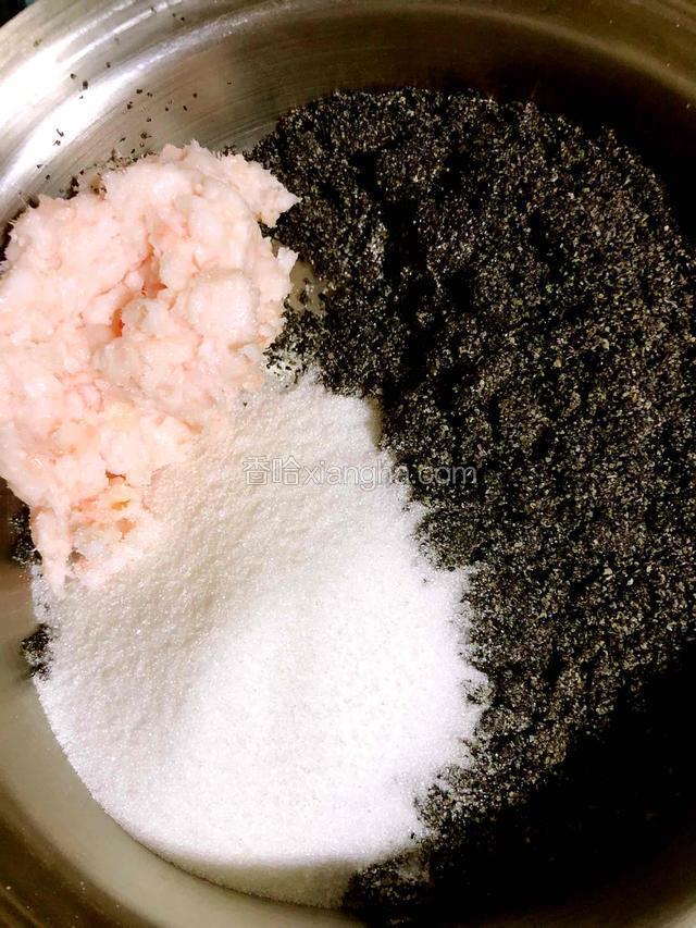 1.馅料图,黑芝麻、糖、猪板油(黄油也可以,以拌匀捏起成型为准)