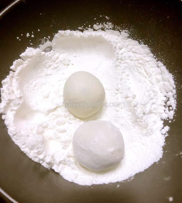 6.开包,搓圆柱、掐剂子、按扁、用手指慢慢把糯米团压成片后包入芝麻馅