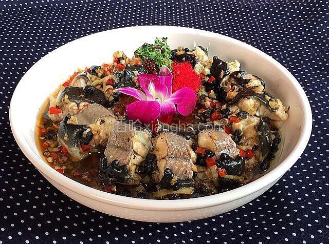 3.用比較熱的開水燙一下. 刮去那層白液後清洗乾淨.然後在背上切一刀. 均勻的切塊,切記留一點皮連著別切斷. 然後將白鳝碼入碟裡圍一圈