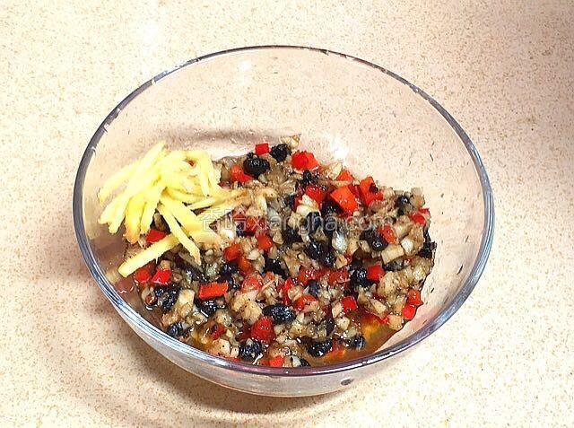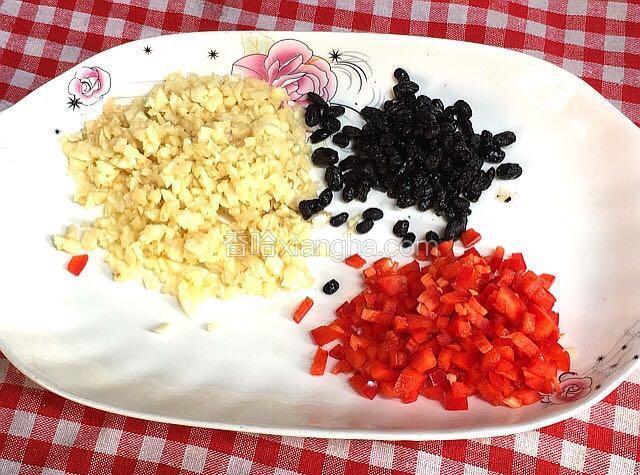 5.熱鍋下花生油倒入蒜頭.豆豉.紅椒粒. 注意用中火炒,加一調羹雞粉. 少許糖. 翻炒均勻即可.