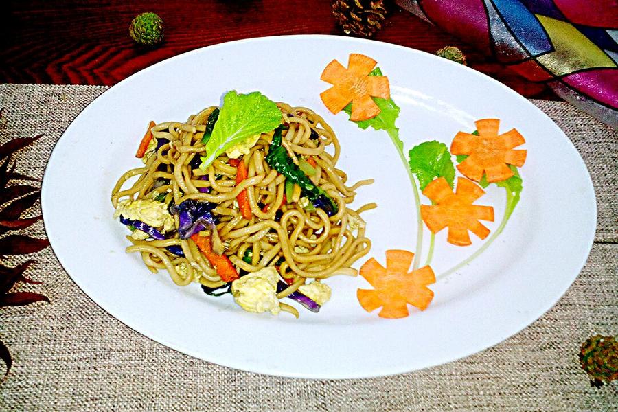 猪肉、鸡蛋、胡萝卜、荷兰豆、香葱、大蒜、粗面条