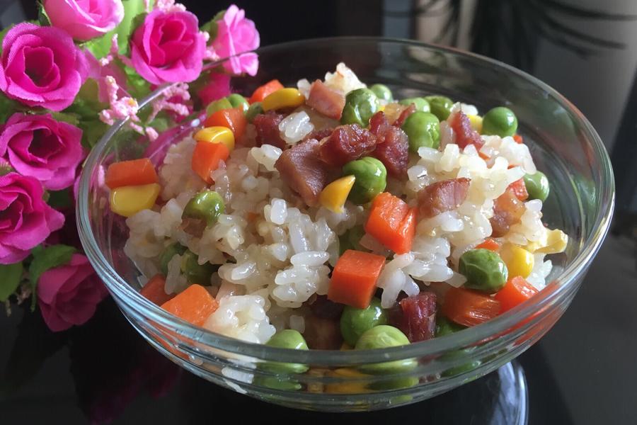 香肠、胡萝卜、豌豆、玉米、火腿肉、盐、猪油、味精