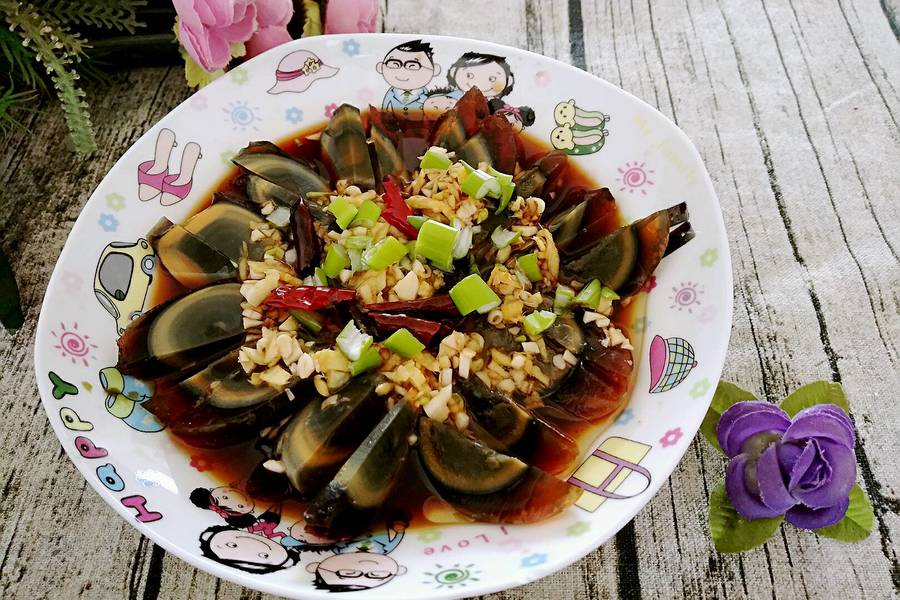 皮蛋、红辣椒、蒜瓣、葱、姜、生抽、花生油、香醋