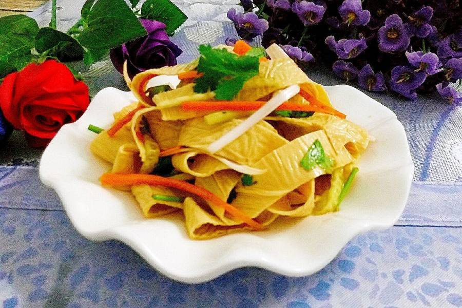 香菜、葱、姜、盐、生抽、香油、味精、麻油、葱油、五香豆腐皮
