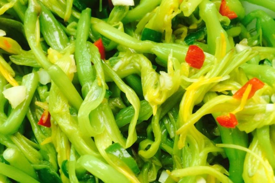 黄花菜、小米椒、杭椒、醋、盐、大蒜、糖、生抽、香油