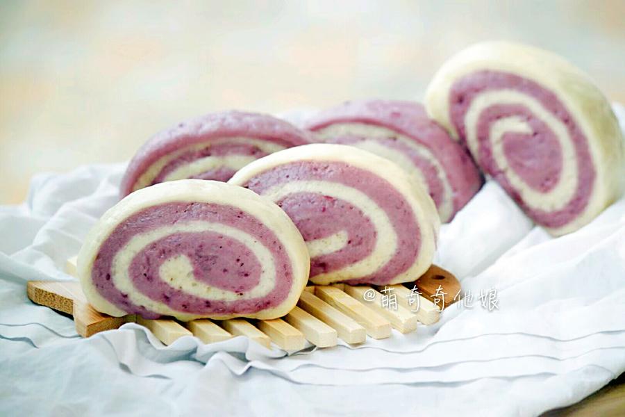 面粉、温水、酵母、紫薯、白糖、食用油(刷蒸格防粘)