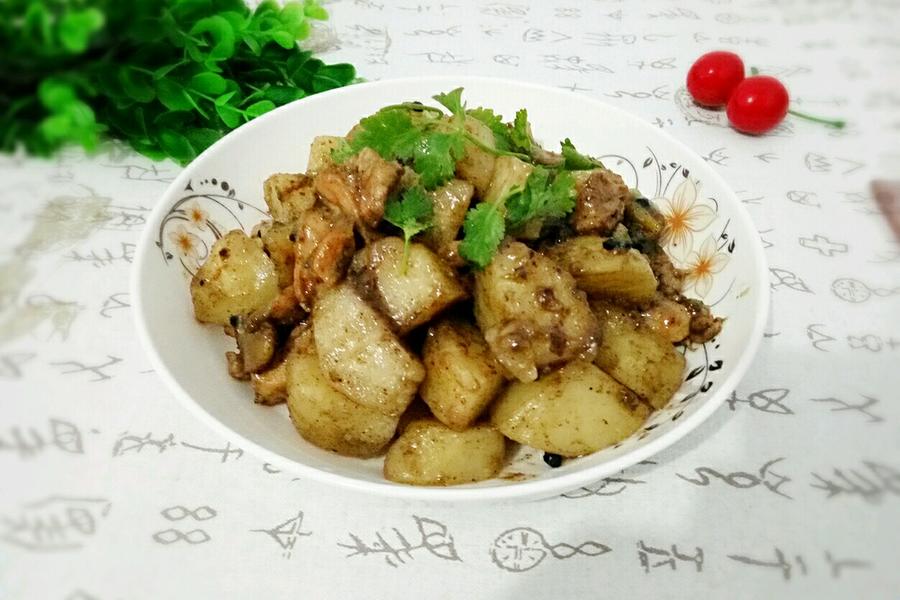 土豆、水、鸡腿肉、葱、姜、料酒、盐、大蒜、八角、食用油、生抽、鸡精、老抽