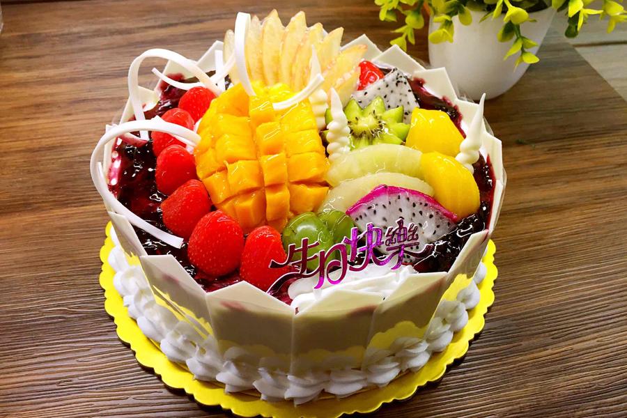 苹果、草莓、猕猴桃、芒果、圣女果、火龙果、黄桃、蓝莓果酱、打发奶油、六寸蛋糕胚、夹心水果、巧克力饰片、奶提子