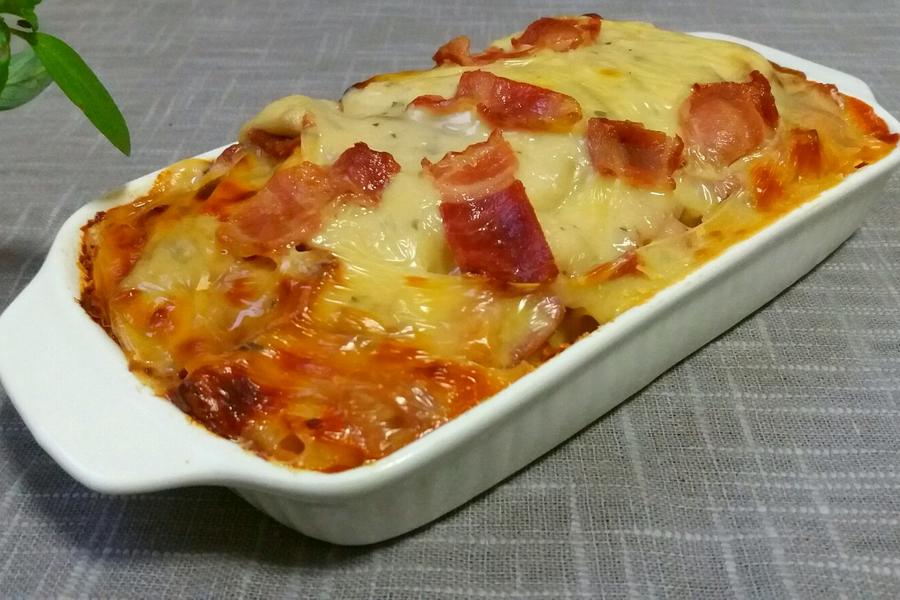 鸡蛋、培根、意大利面、意面番茄酱、黑椒汁