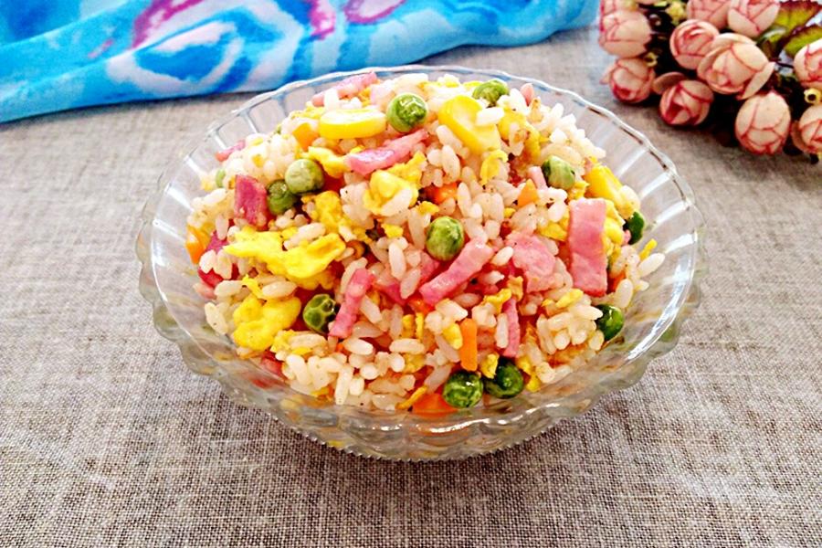 鸡蛋、胡萝卜、米饭、玉米粒、培根、豌豆粒