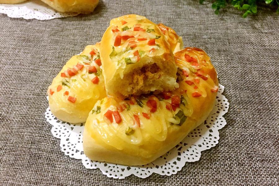 鸡蛋、水、水、火腿肠、酵母、酵母、高筋面粉、高筋面粉、肉松、奶粉、全蛋液、馅料:、葱、黄油、盐、糖、沙拉酱、主材料:、装饰材料:、波兰酵种材料: