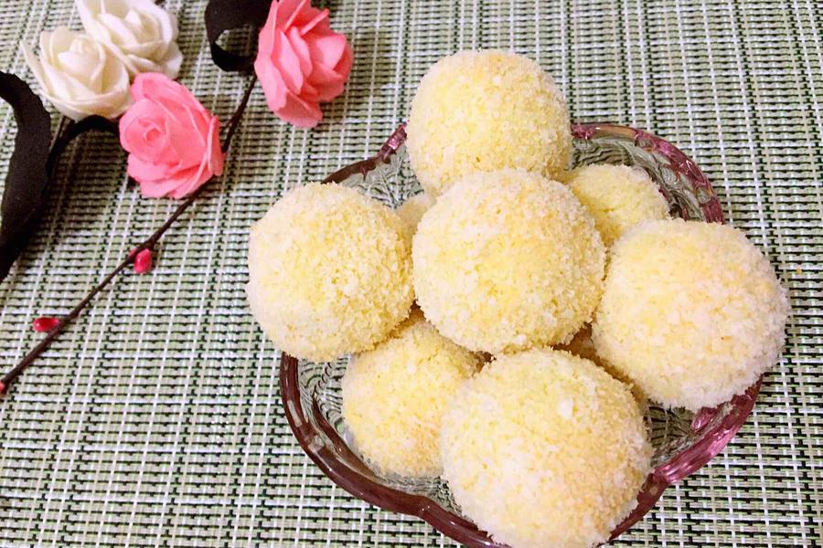 鸡蛋、低筋面粉、奶粉、椰蓉、白糖、椰蓉(粘表面)