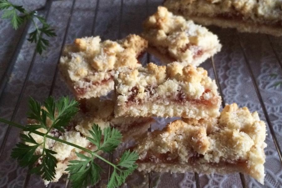低筋面粉、奶粉、全蛋液、黄油、砂糖、椰蓉、草莓果酱