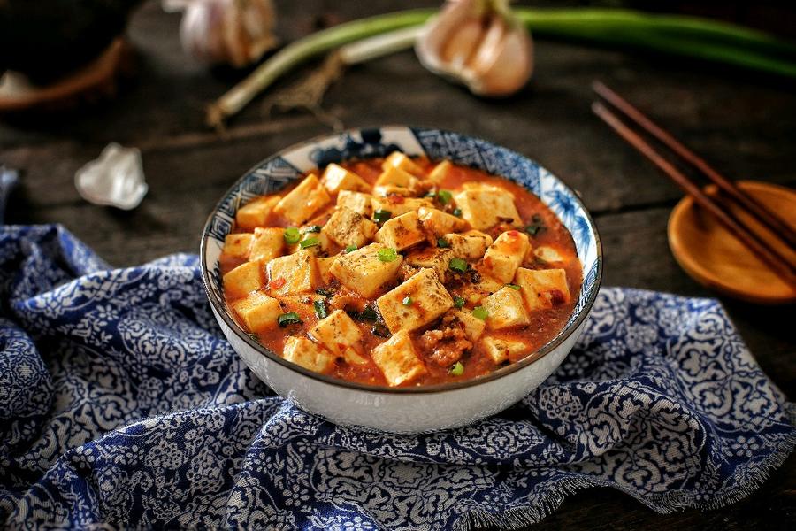 豆腐、小葱、牛肉或猪肉、大蒜、食用油、清水、花椒粉、辣椒粉、淀粉、郫县豆瓣酱、花椒粒