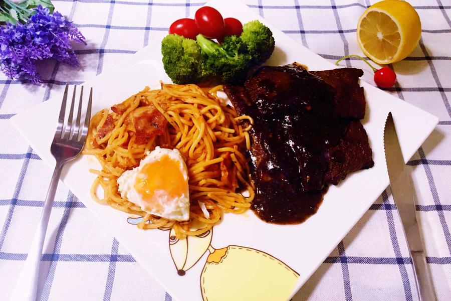 鸡蛋、西兰花、小番茄、意大利面、菲利牛排