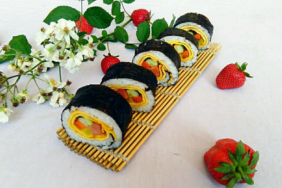 鸡蛋、胡萝卜、黄瓜、大米、火腿肠、肉松、寿司紫菜、寿司大根条
